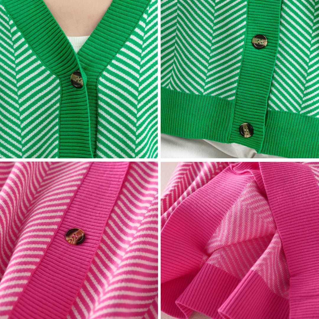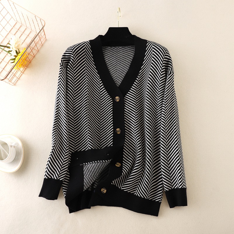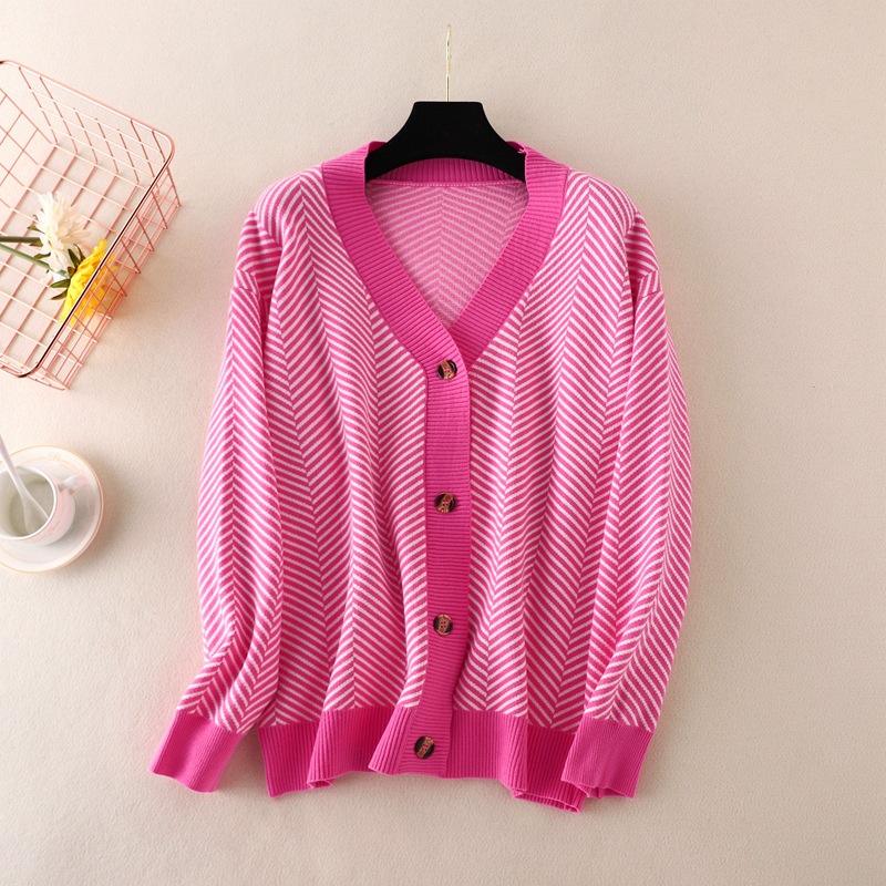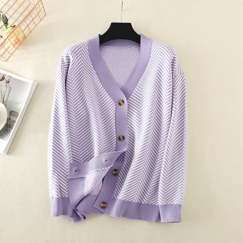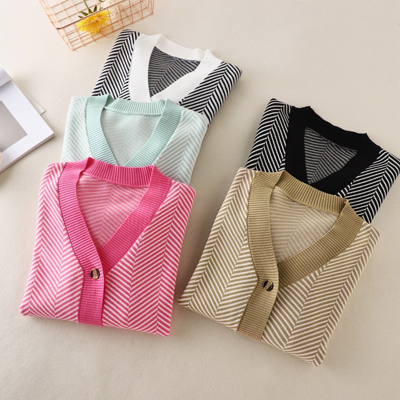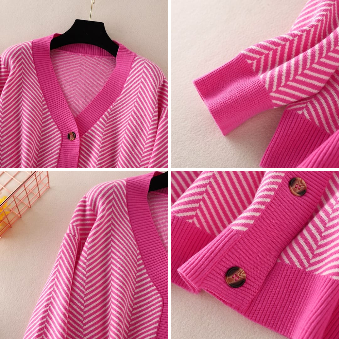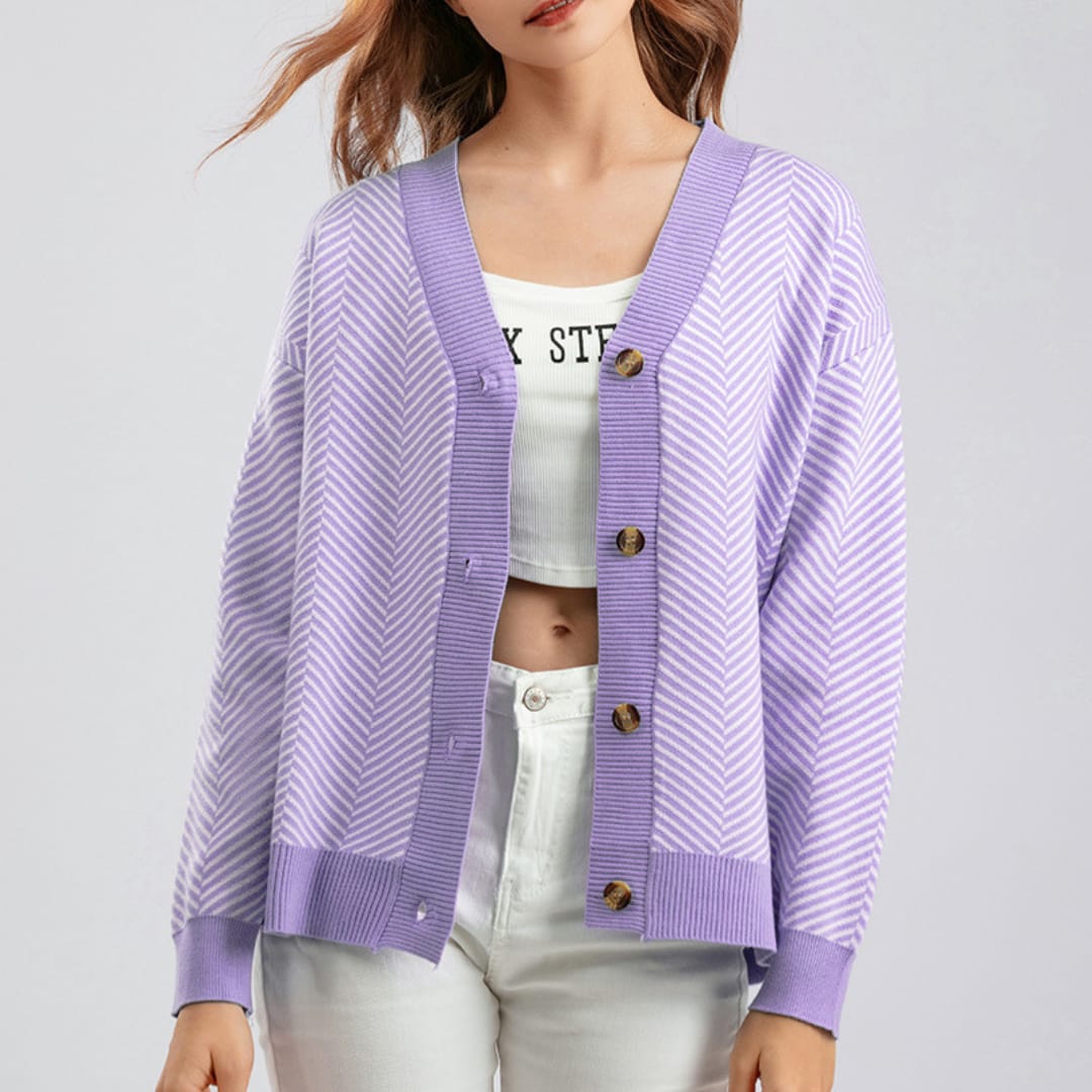Add a layer of cozy charm with this Women’s V-Neck Loose Fit Striped Cardigan — the perfect mix of comfort and classic style.