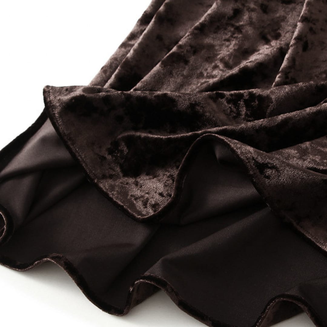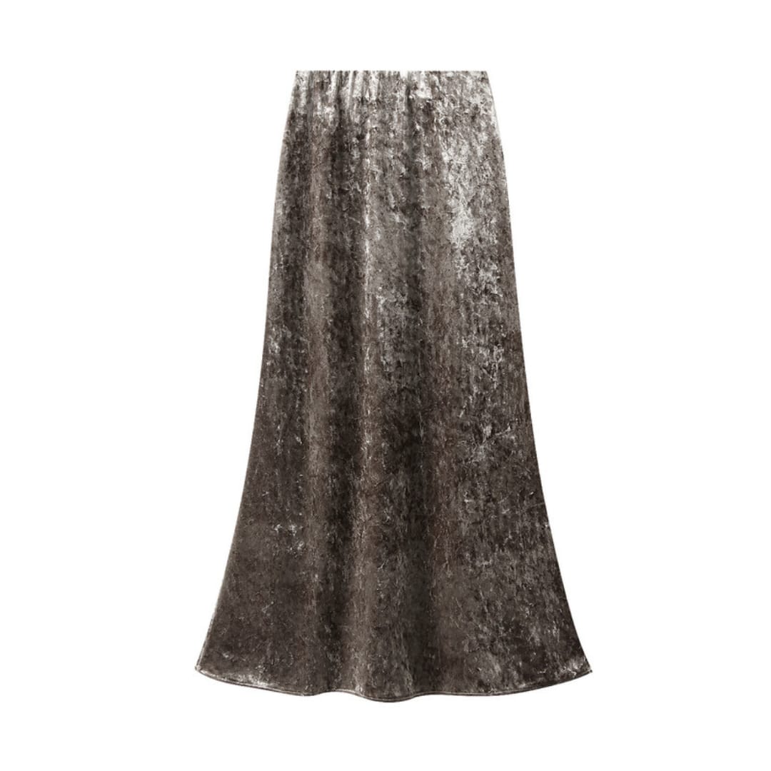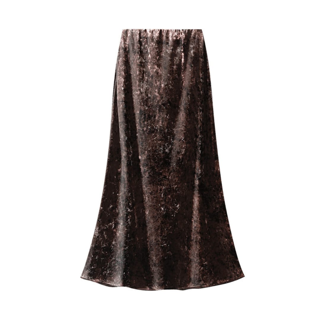 Elegant velvet A-line midi skirt with a soft drape and timeless silhouette for refined everyday wear.
