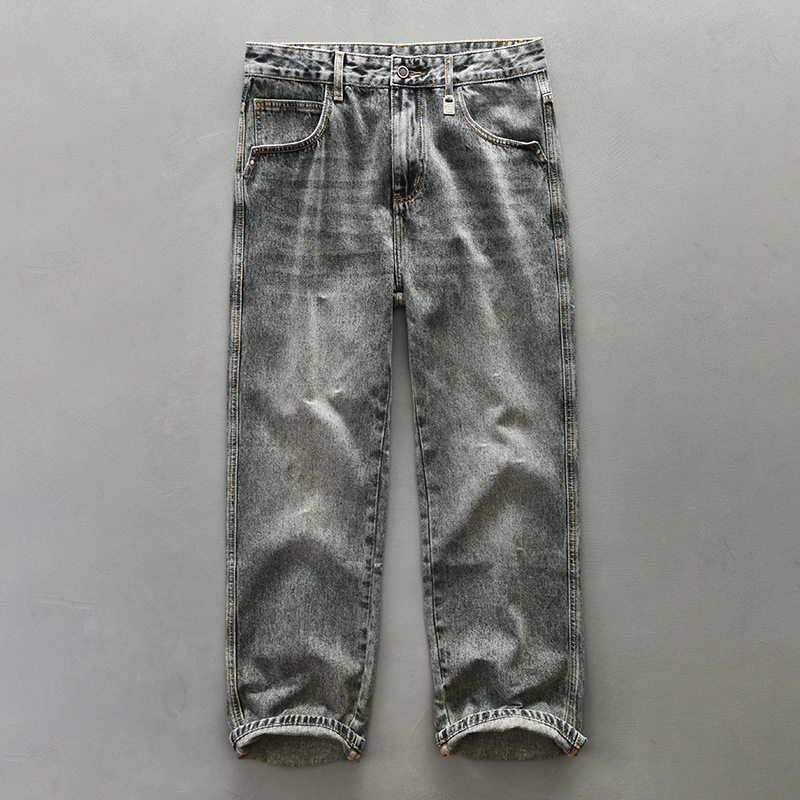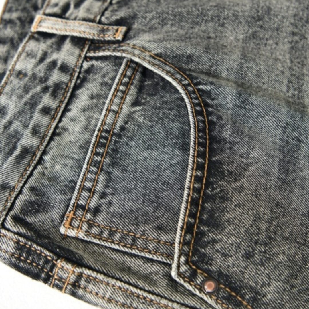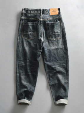 High-quality retro vintage inspired washed denim jeans for men, perfect for fall, winter, and spring, offering durable fabric, classic style, and all-season comfort.
