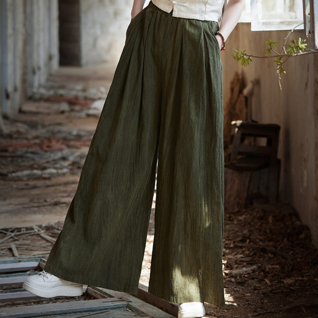 Experience style and comfort combined with our Women�'s Wrinkled Ramie Cloth Wide Leg Pants. Made from high-quality ramie fabric, these pants offer exceptional breathability and a naturally textured, wrinkled finish for a laid-back yet elegant look. The wide-leg design provides a relaxed, flowy fit that moves beautifully and flatters all body types. Ideal for warm weather, casual outings, workdays, or travel, these versatile pants pair easily with blouses, tanks, or lightweight sweaters. The comfortable waistband ensures all-day ease, making these ramie wide-leg pants a must-have piece for effortless, modern, and natural-style dressing.