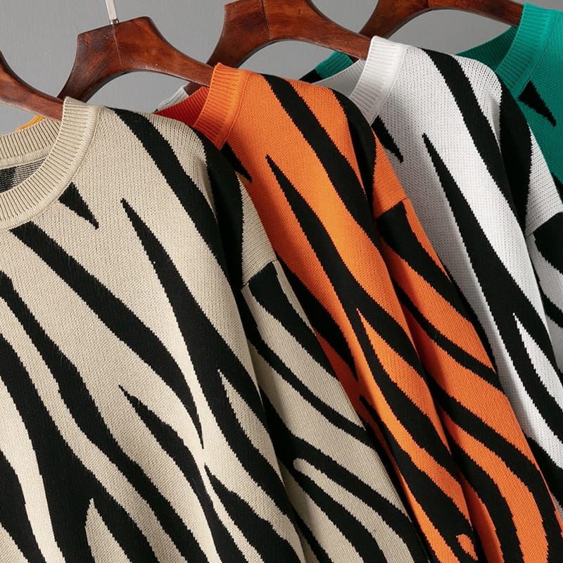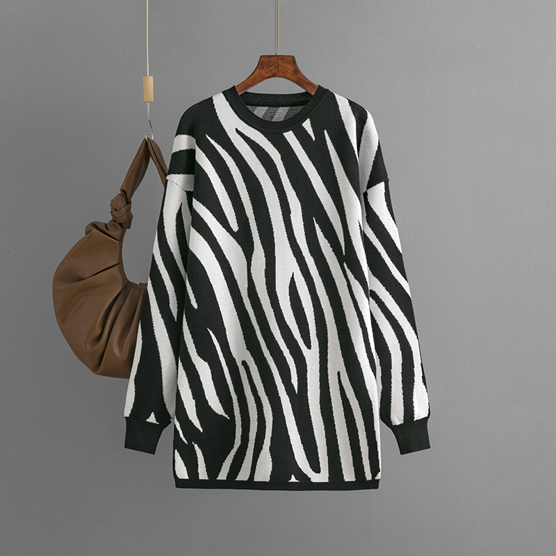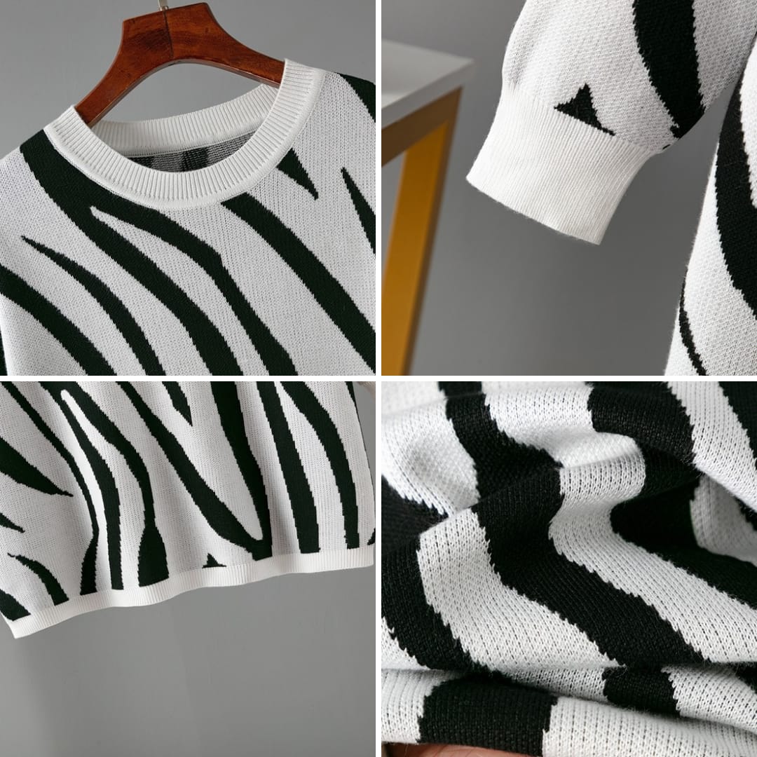 Zebra Pattern Knitted Round Neck Sweater