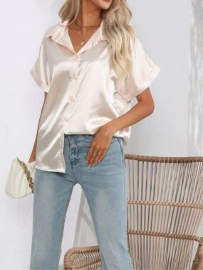 Stay effortlessly stylish with this Women’s Short Sleeve Basic Satin Shirt, designed with a silky-smooth finish and a modern, minimalist cut for everyday elegance.